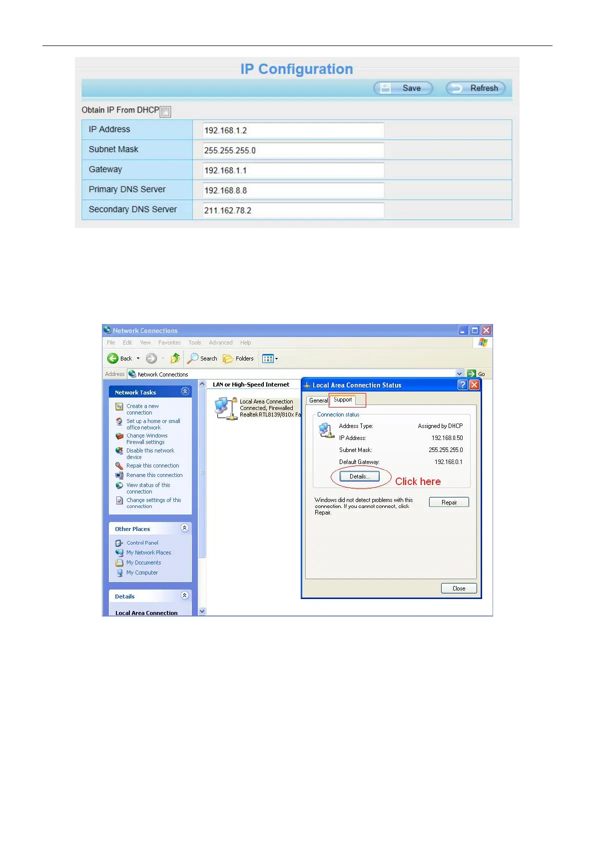 Control Panel > Network Connections > Local Area Connections > Choose Support > Details.