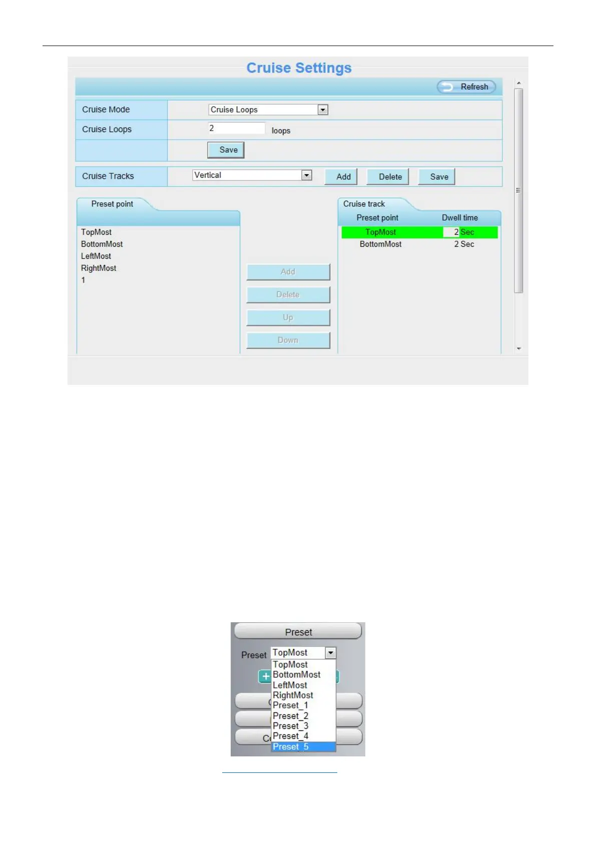 Before adding one cruise track, please set all the presets of one cruise track on Live Video page. For example,