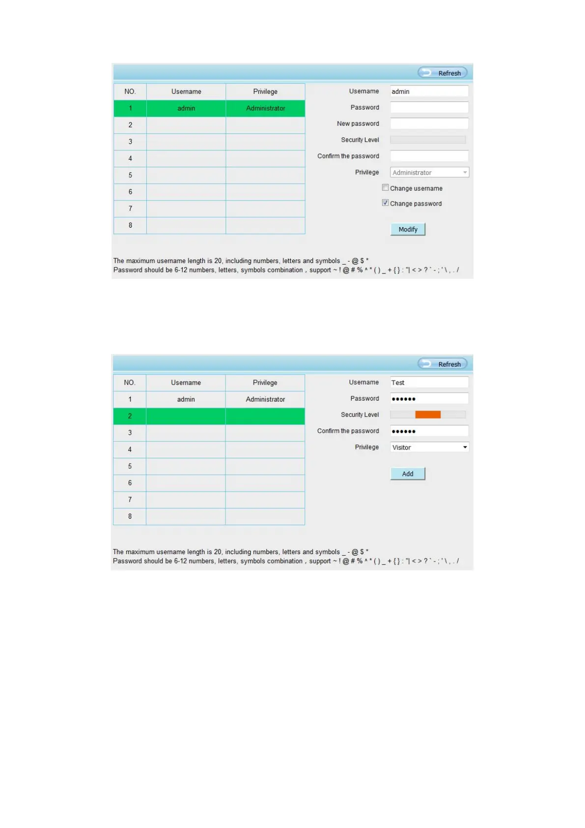 Select one blank column, then enter the new user name, password and privilege, last click Add to take effect.
