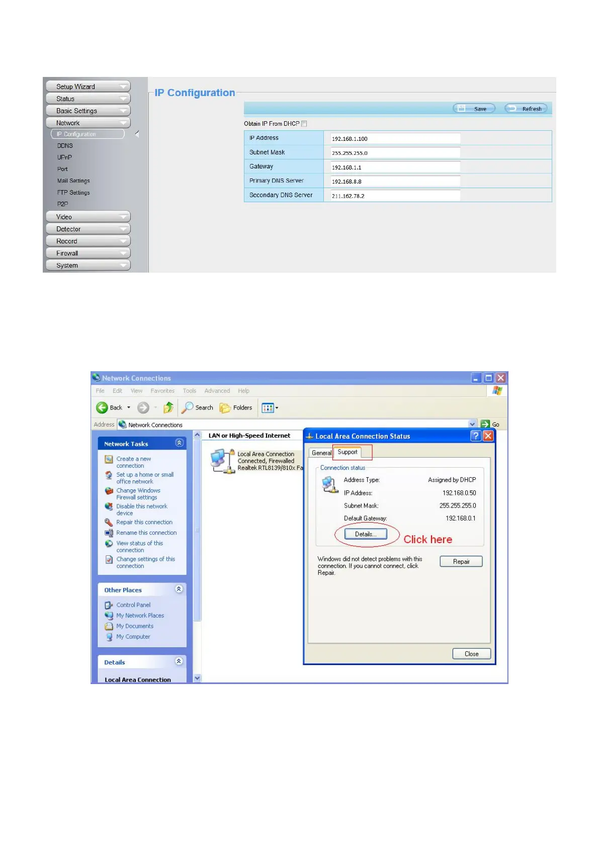 Control Panel > Network Connections > Local Area Connections > Choose Support > Details.