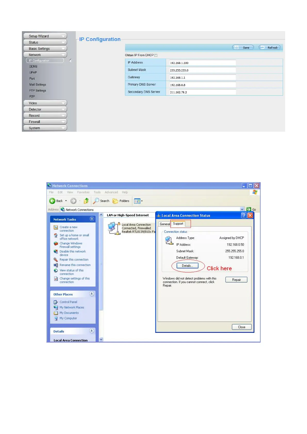 Control Panel > Network Connections > Local Area Connections > Choose Support > Details.