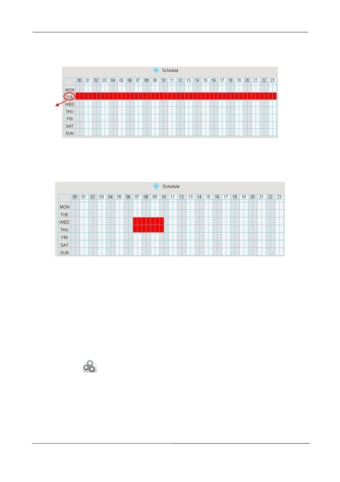 For example, click TUE, the all column of TUE turns to red, that means during Tuesday whole day,
