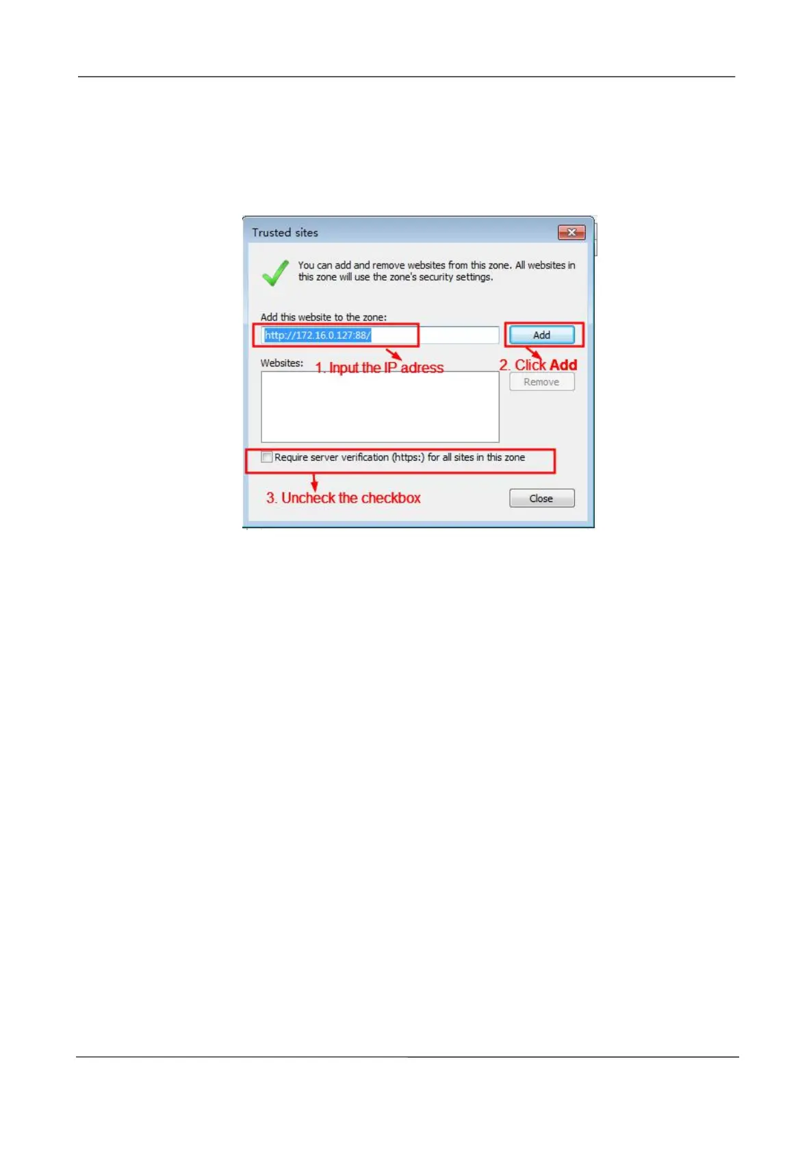 Options > Security, Select Trusted sites > then click Sites, it will pop up the page, as shown in the