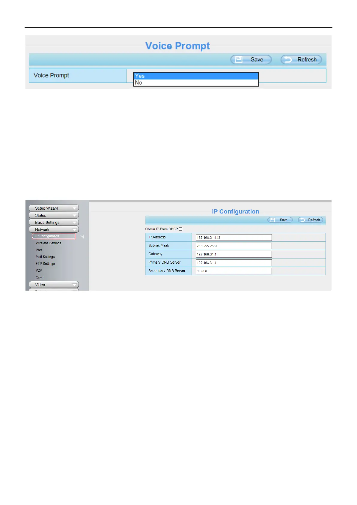 This section will allow you to configure your camera's IP, Wireless Settings, Port, Mail Settings and FTP