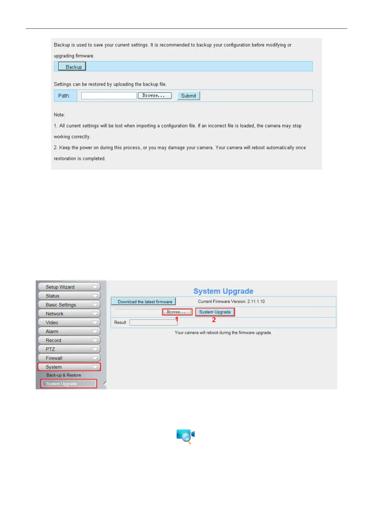 firmware. Then select Upgrade Firmware and enter the username and password, choose the firmware file, and