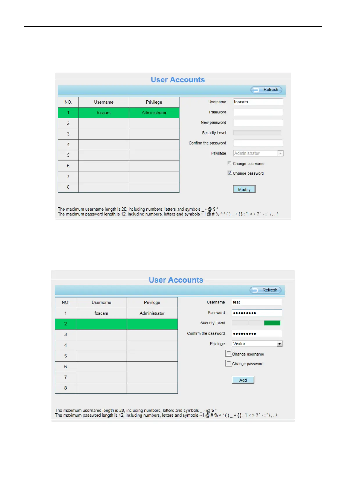 Select one blank column, then enter the new user name, password and privilege, last click Add to take effect.