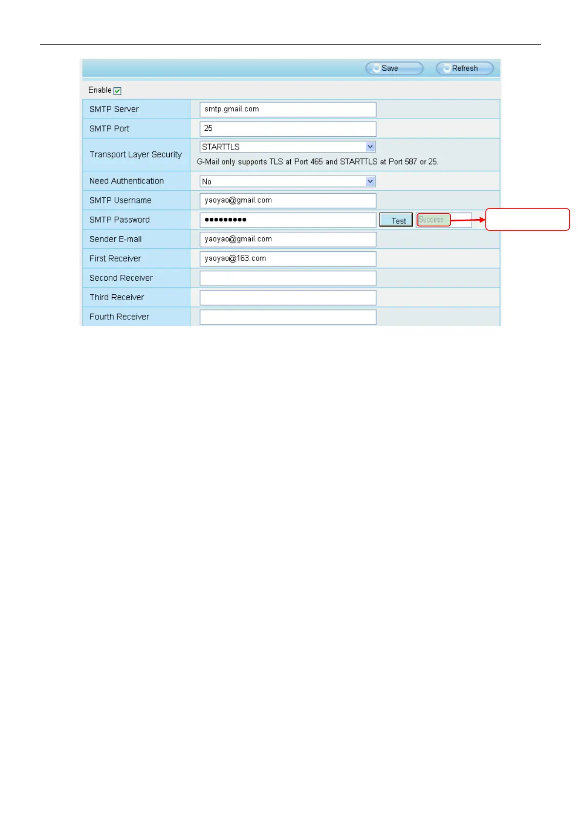 If the test success, you can see the Success behind the Test, at the same time the receivers will receive a test