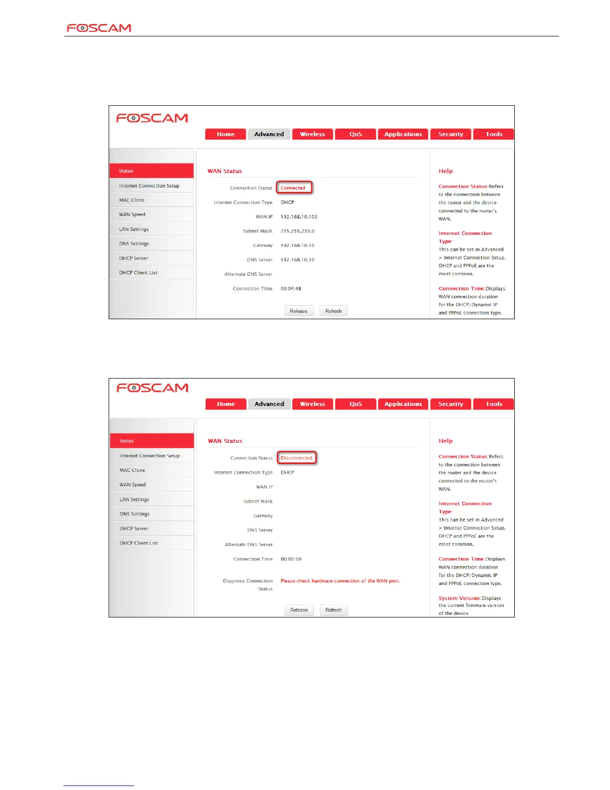 2. If connection status displays "Disconnected" and there is no WAN IP address displayed (as seen below), connection between the