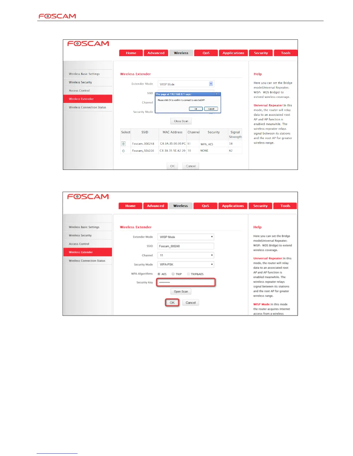 2. Select the AP you wish to connect, such as Foscam-000248, click OK, and click Close Scan