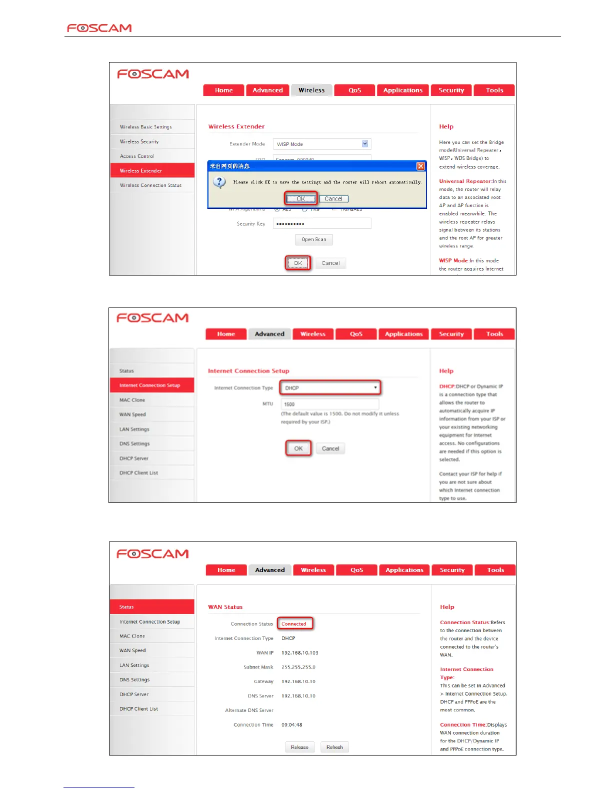5. Internet Connection Setup: Click Advanced>Internet Connection Setup, select Internet Connection Setup, such as DHCP, and click OK.