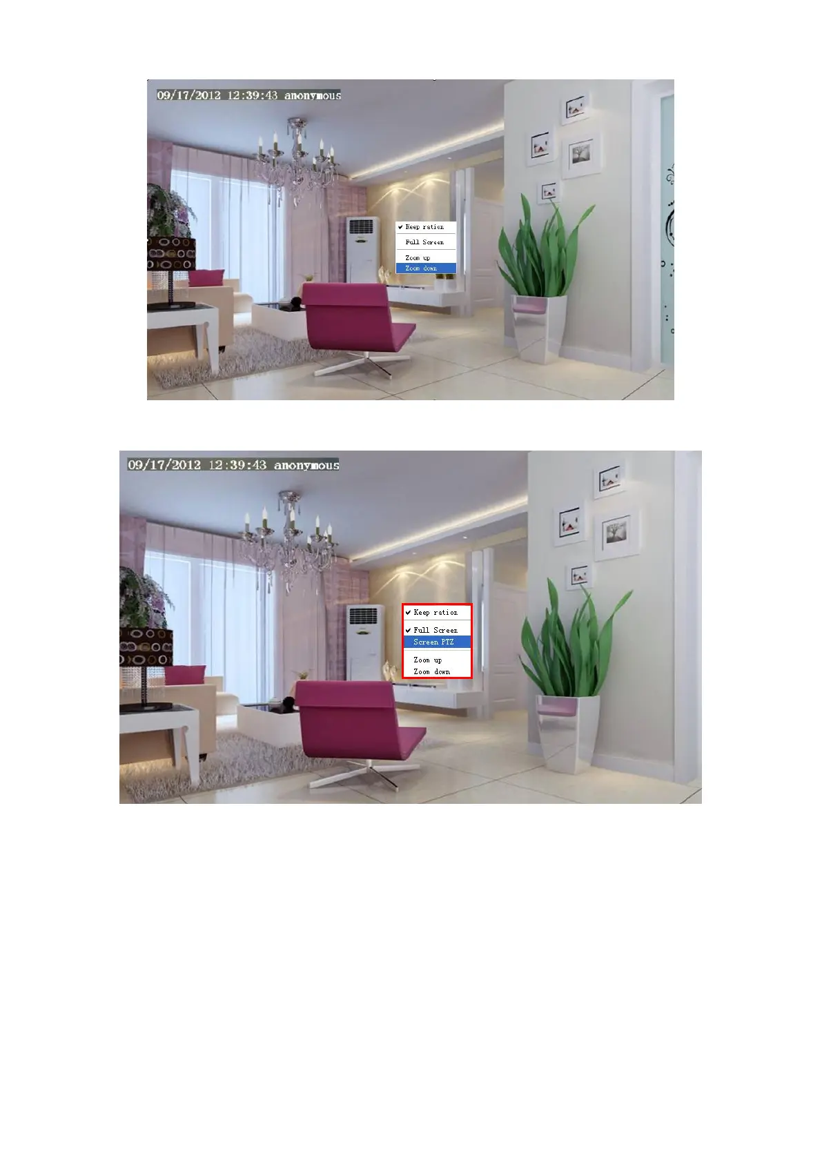 Click the Screen PTZ button and put the mouse on the screen to indicate the camera move direction you