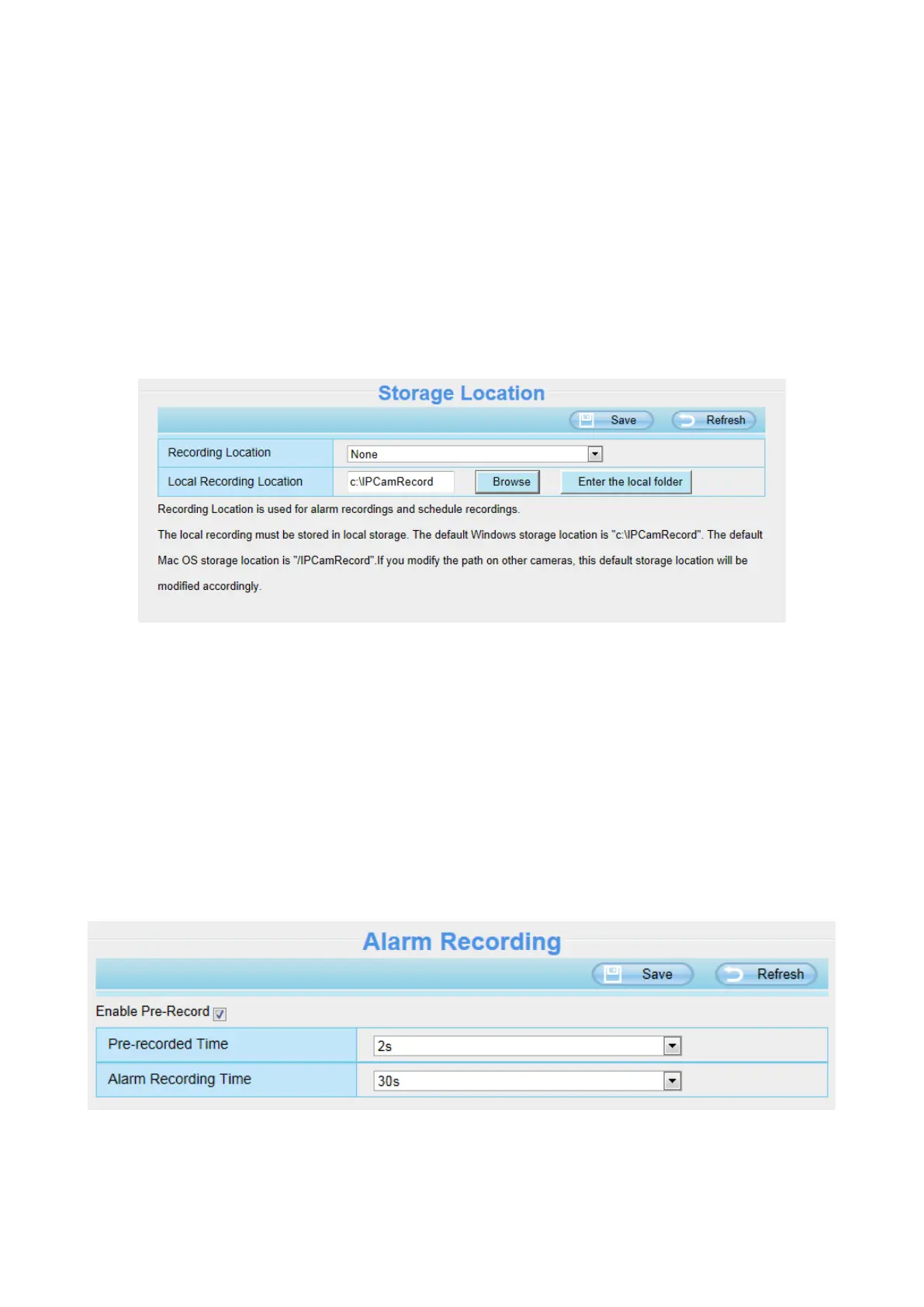 Local Recording Location: For Windows OS, the manual recording path is C:/ IPCamRecord, you can