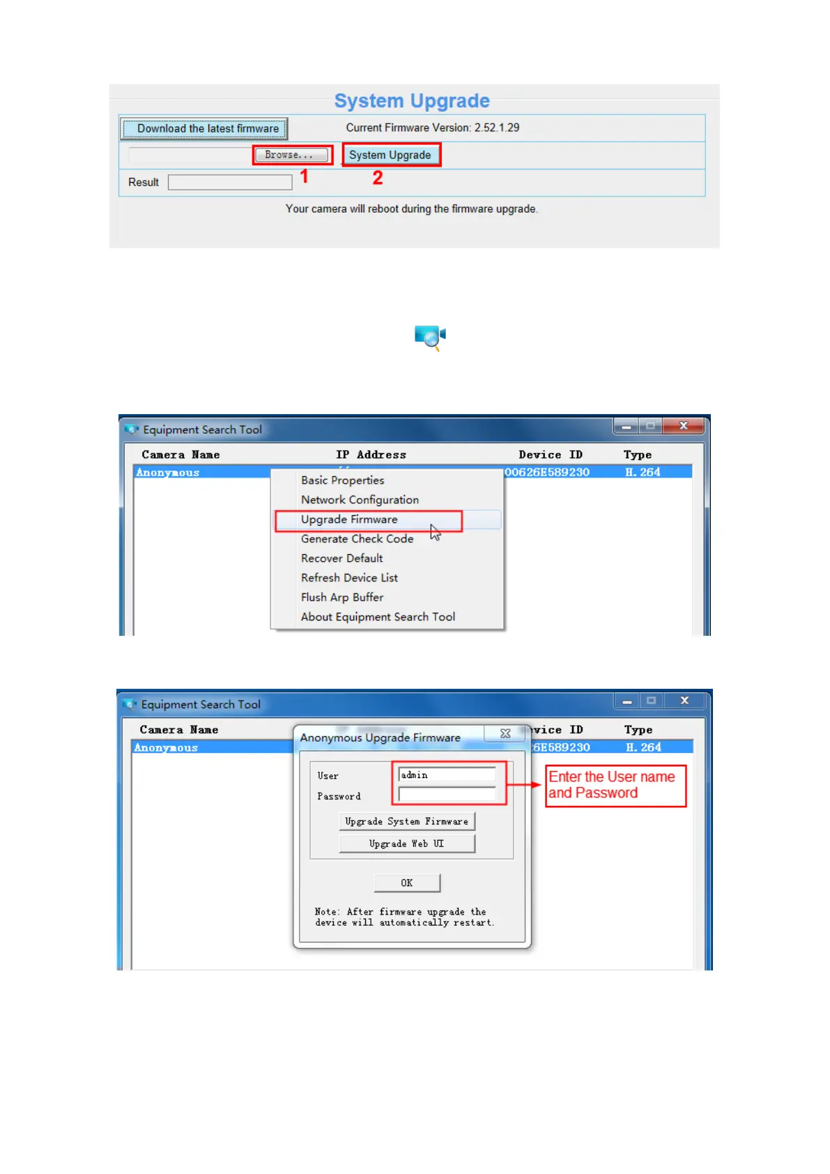 upgrade the firmware. Then select Upgrade Firmware and enter the username and password, choose