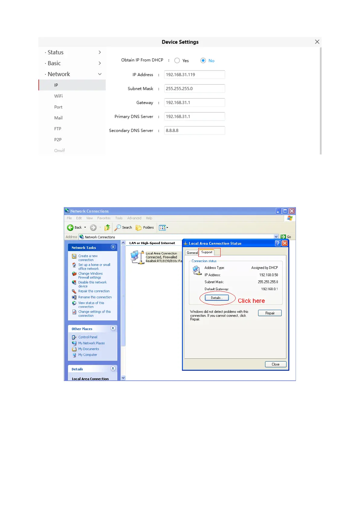 Control Panel--Network Connections--Local Area Connections --Choose Support--Details.