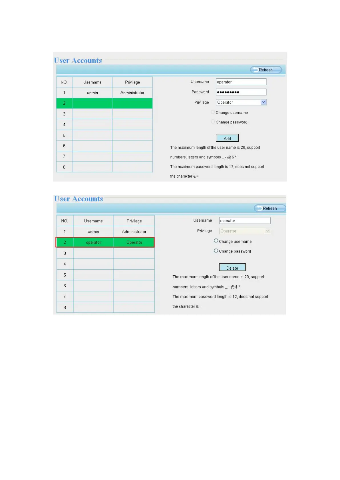 Delete: Select the account which you want to delete, then click Delete button to take effect.
