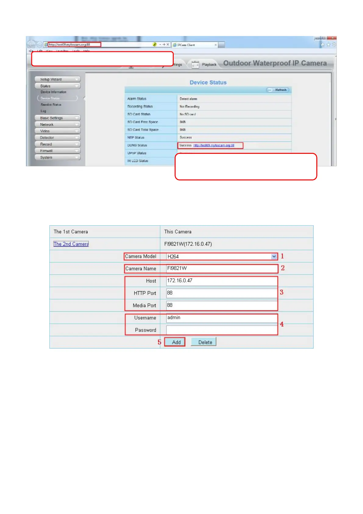NOTE: Here the Host must be entered as the second camera's DDNS domain name, not its LAN IP.