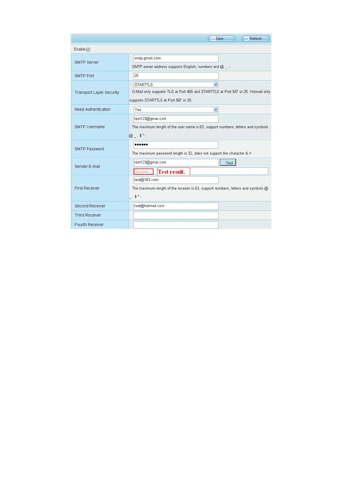If the test success, you can see the Success behind the Test, at the same time the receivers will receive a test