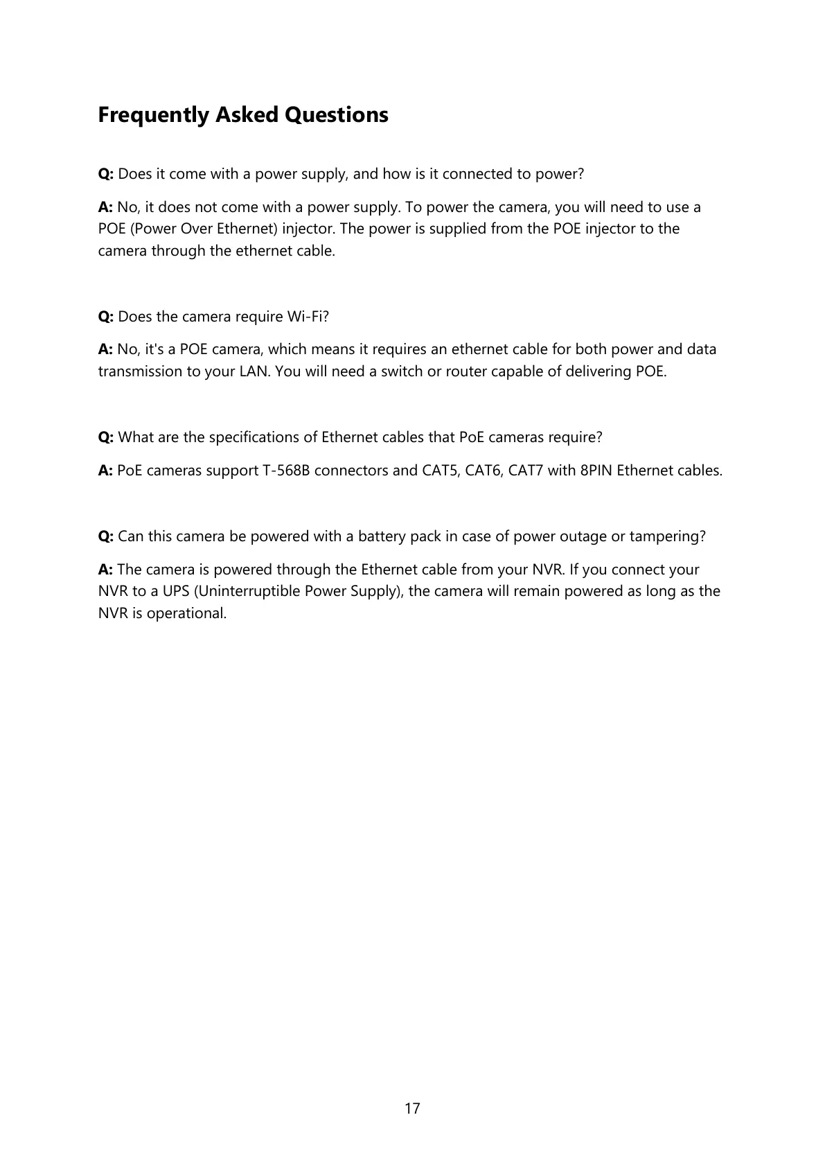 A: The camera is powered through the Ethernet cable from your NVR. If you connect your