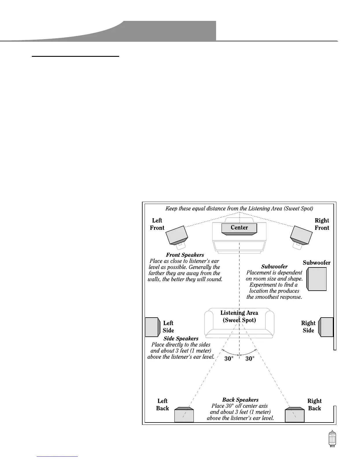• These speakers should be placed at the same relative height from the floor, the same distance from the listening area and