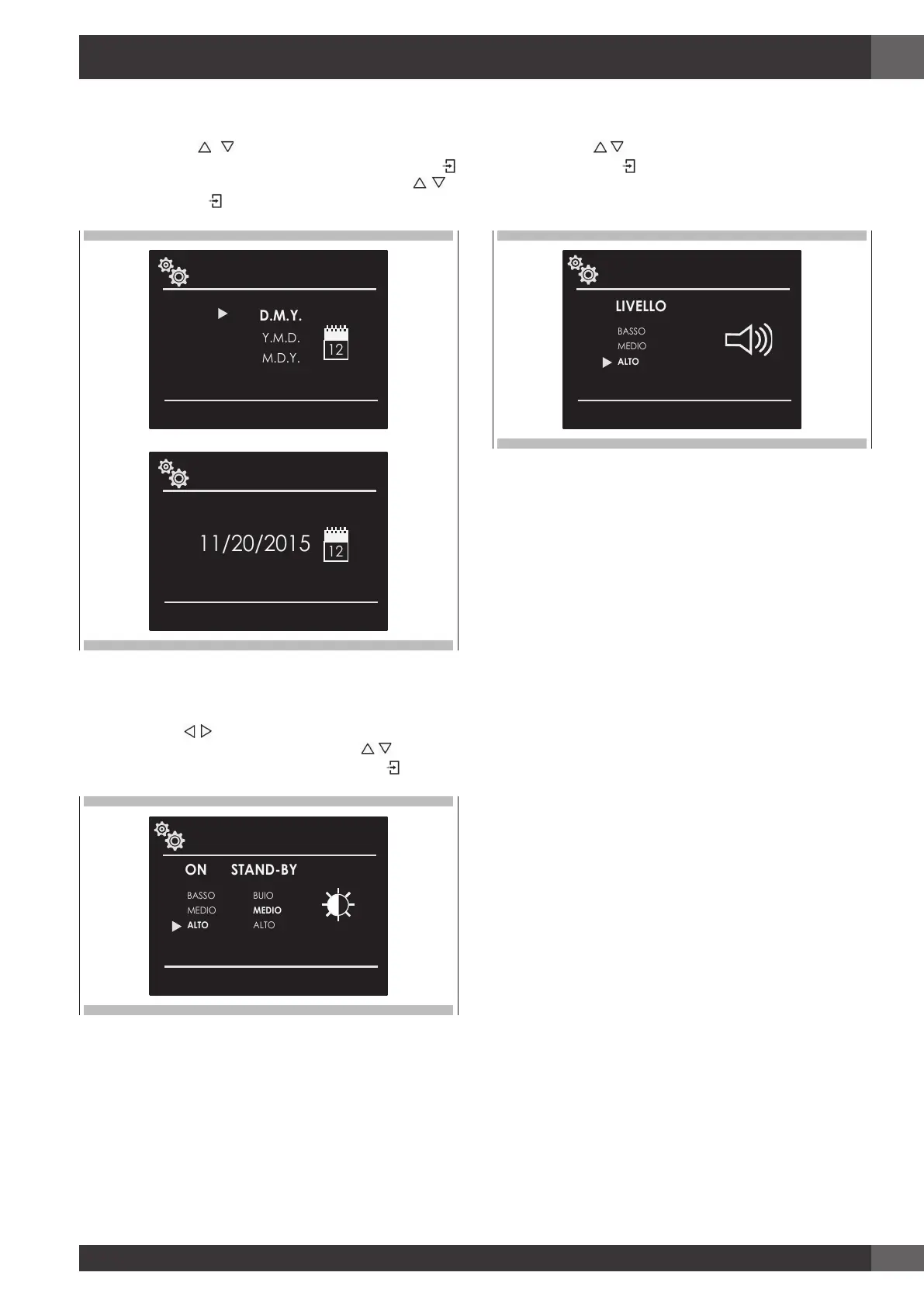 cambiare tra ON o STANDBY, poi tramite le frecce