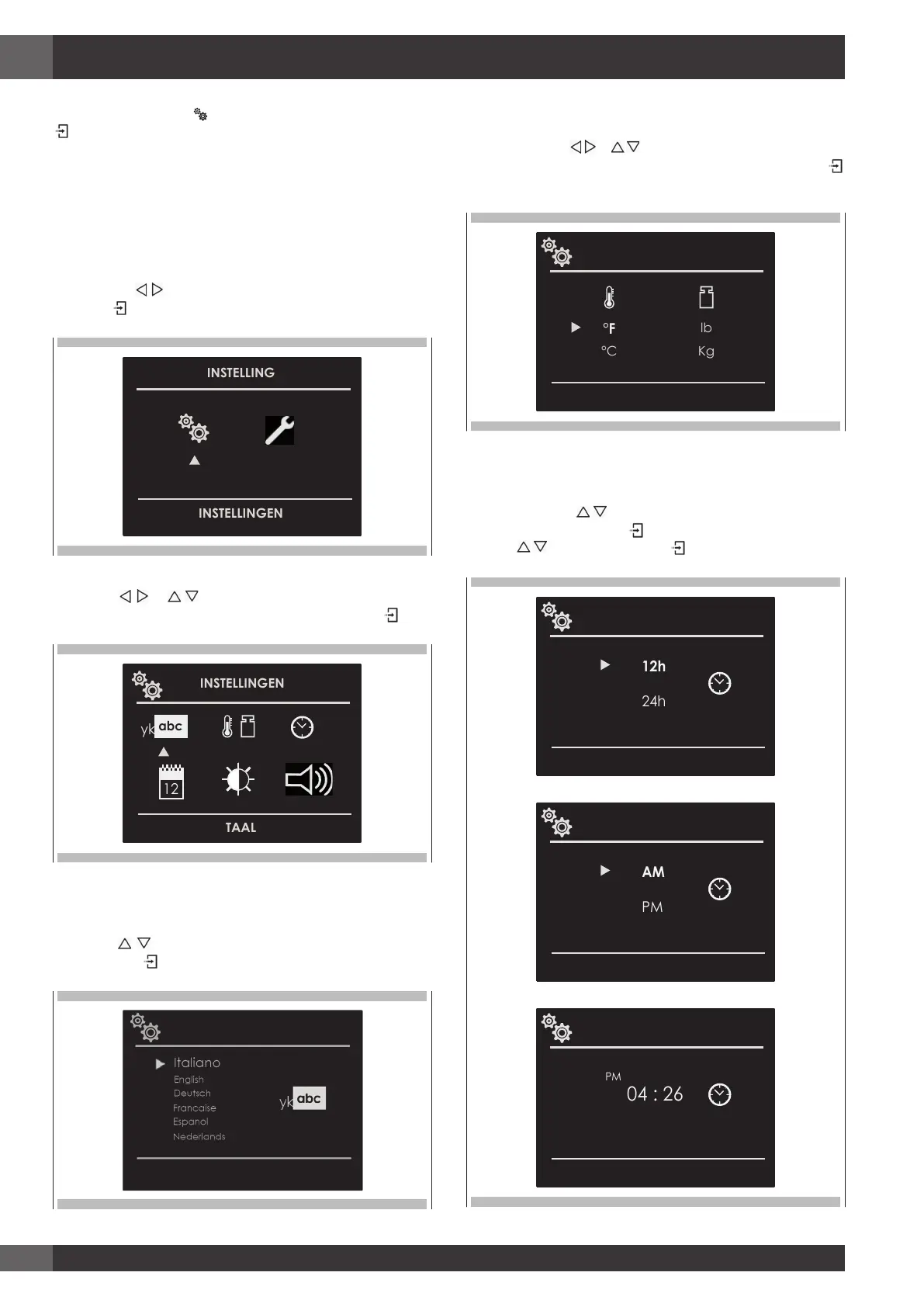 “°C/°F” of gewichtopties Kg/ib te selecteren en bevestig met de