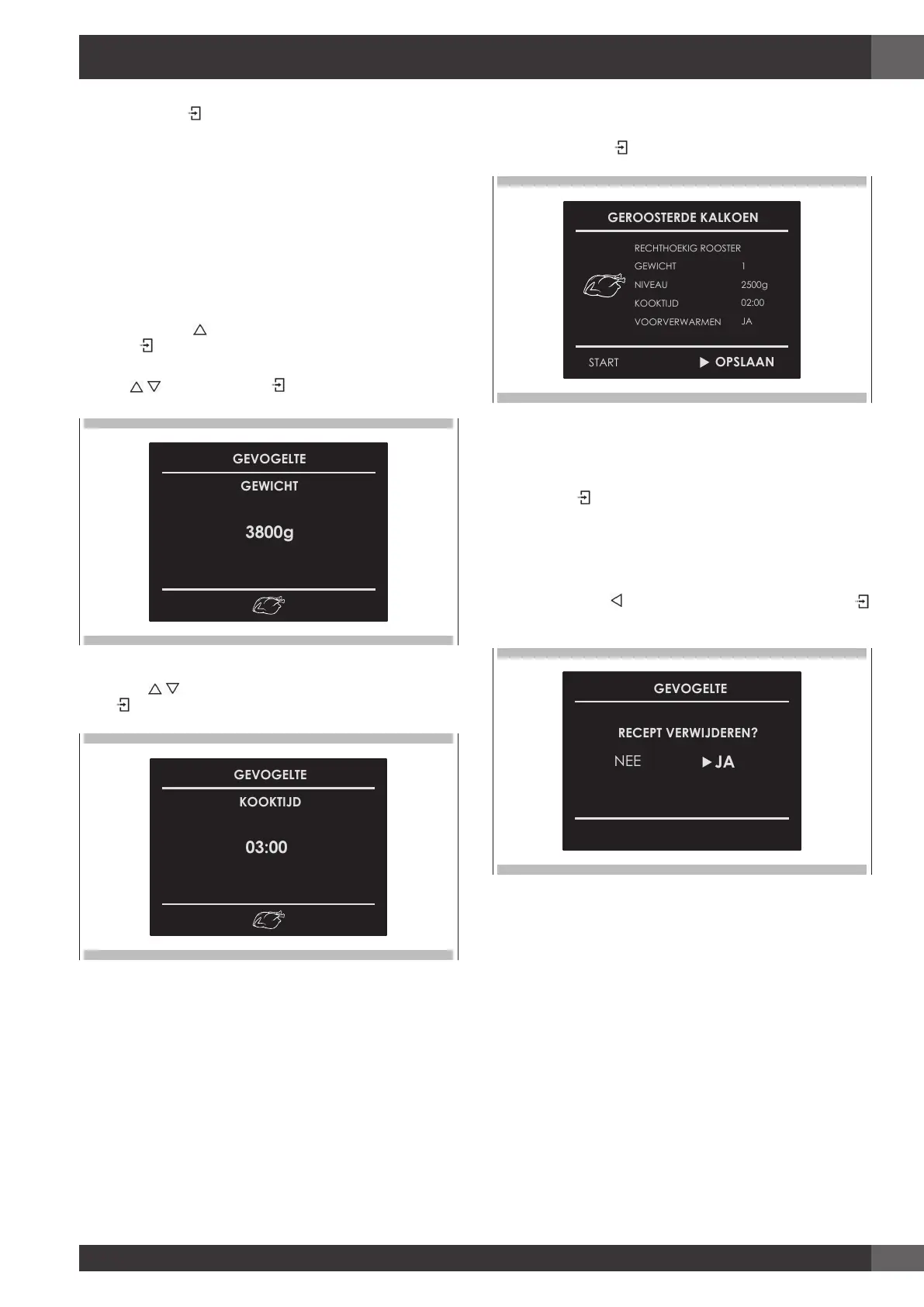 Als er een recept geselecteerd is, kunnen de “Tijd” en “Gewicht”