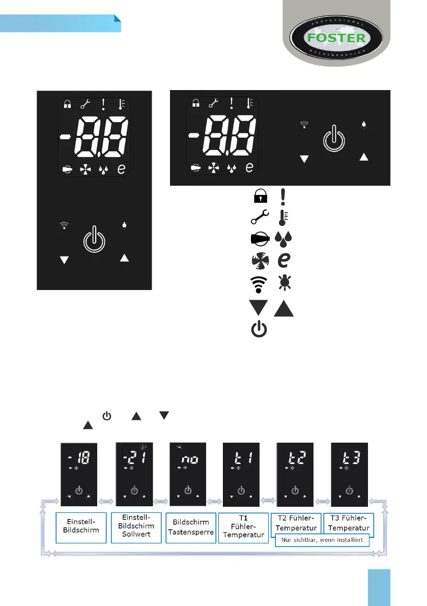 Dazu gehören Sollwert, Tastensperre und die Anzeige der Temperatursonden T1, 2 oder 3.