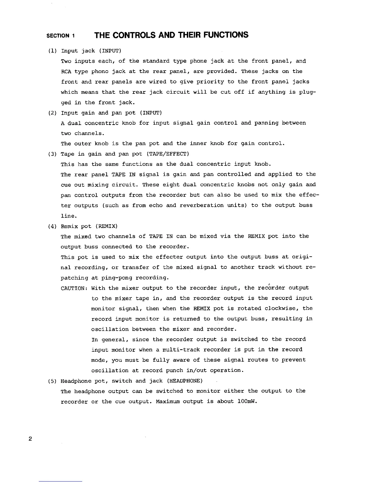 Fostex 2050 - The Controls and Their Functions; Input Jacks and Gain;Pan; Tape In, Remix, and Headphone Controls