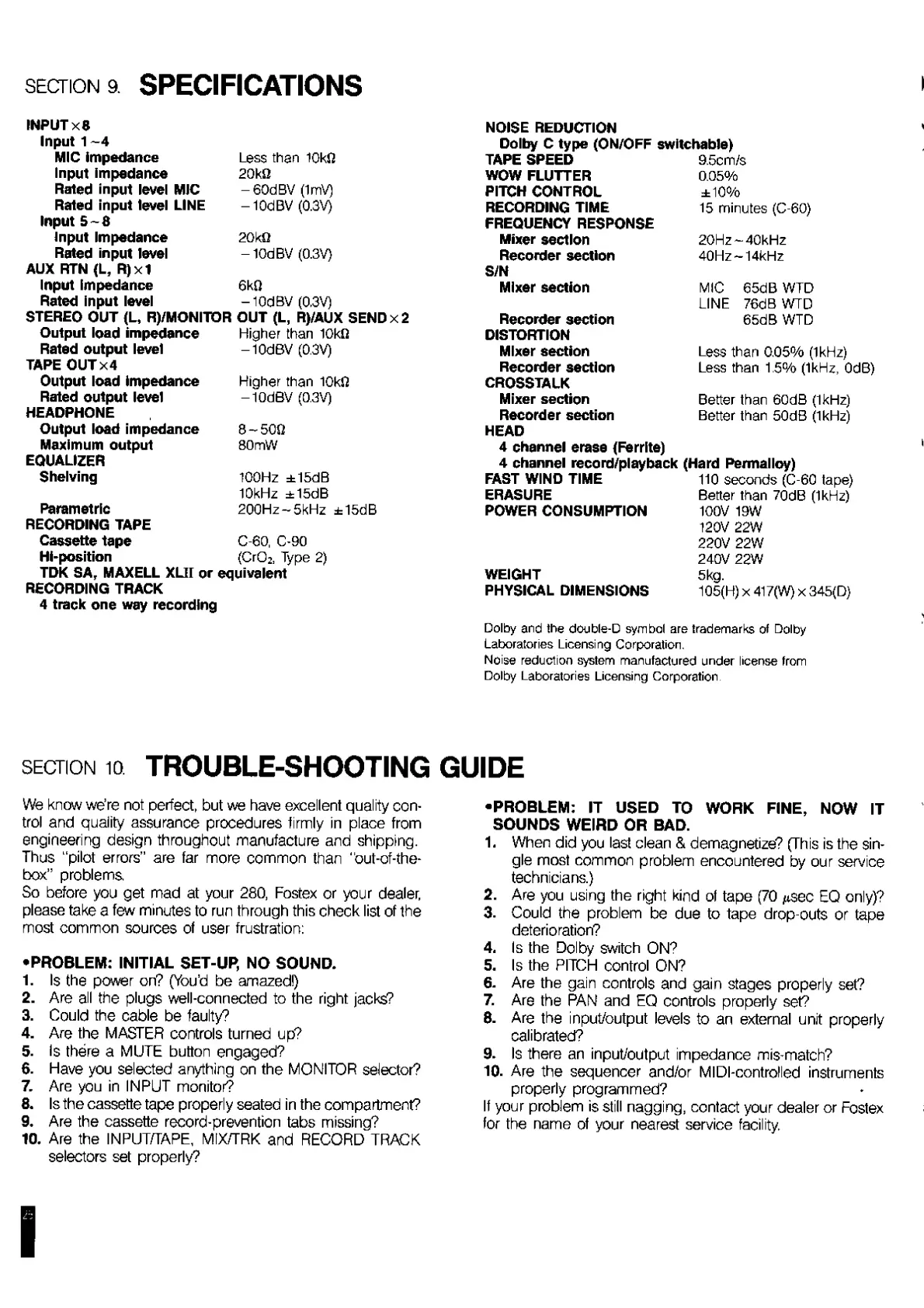 Fostex 280 - Specifications; Technical Specifications; Trouble-Shooting Guide; Initial Set-Up, No Sound