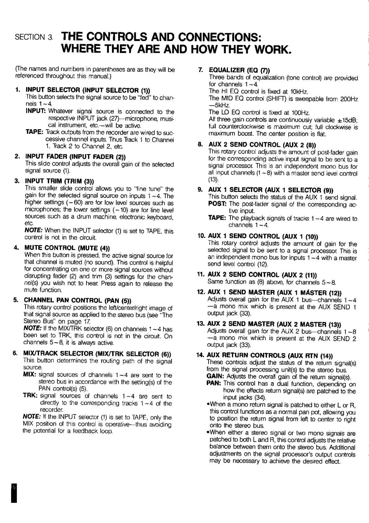 Fostex 280 - Controls and Connections Overview; Input and Channel Controls; Auxiliary Send and Return Functions