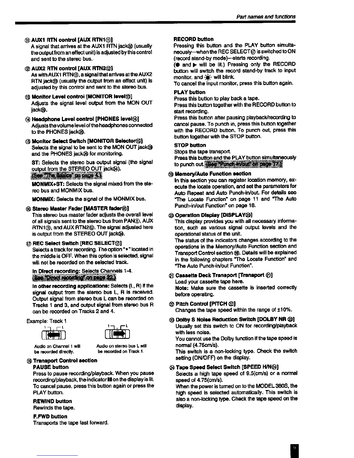 Fostex 380S - Additional Control Functions; AUX Return and Level Controls; Monitoring, Tape Transport, and Function Controls