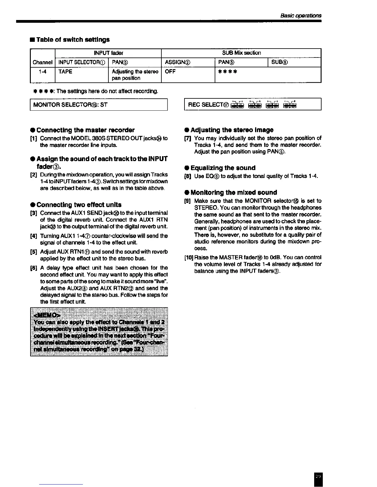 Fostex 380S - Mixdown Procedures; Connecting Master Recorder; Using Effect Units in Mixdown; Adjusting Stereo Image and EQ