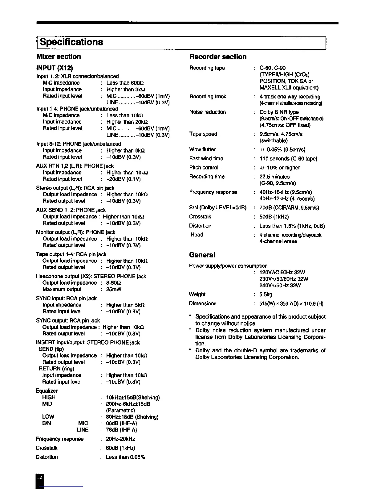 Fostex 380S - Product Specifications; Mixer Section Specifications; Recorder Section Specifications; General Specifications