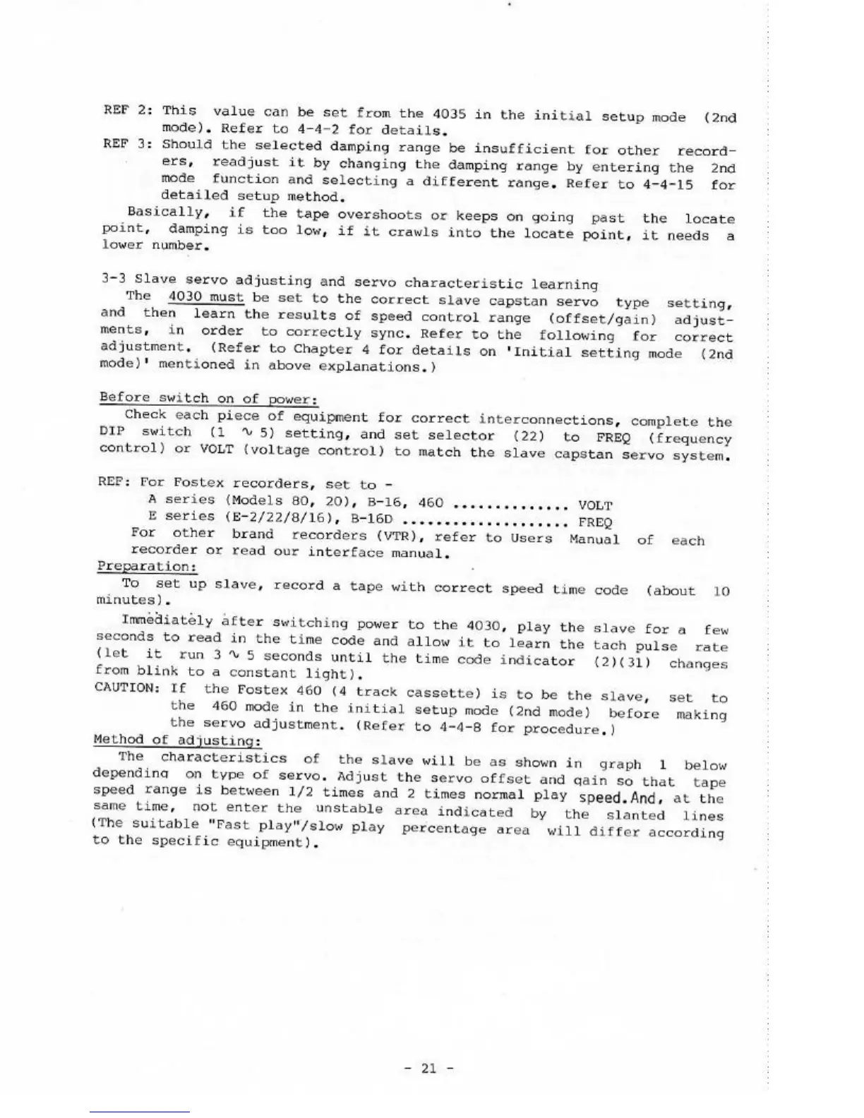 Fostex 4030 - Before Switch on Power; Method of Adjusting; Slave Servo Adjusting and Servo Characteristic Learning