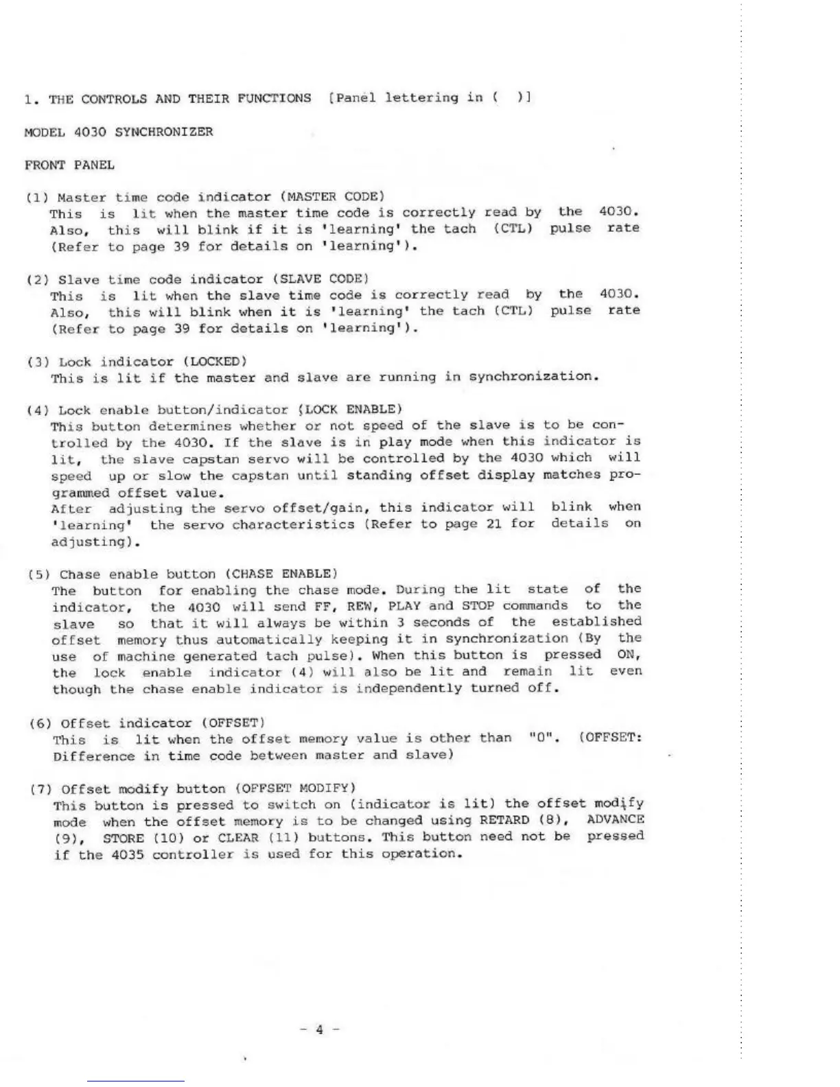 Fostex 4030 - Front Panel Facilities; Lock Enable Button;Indicator; Chase Enable Button; Offset Modify Button