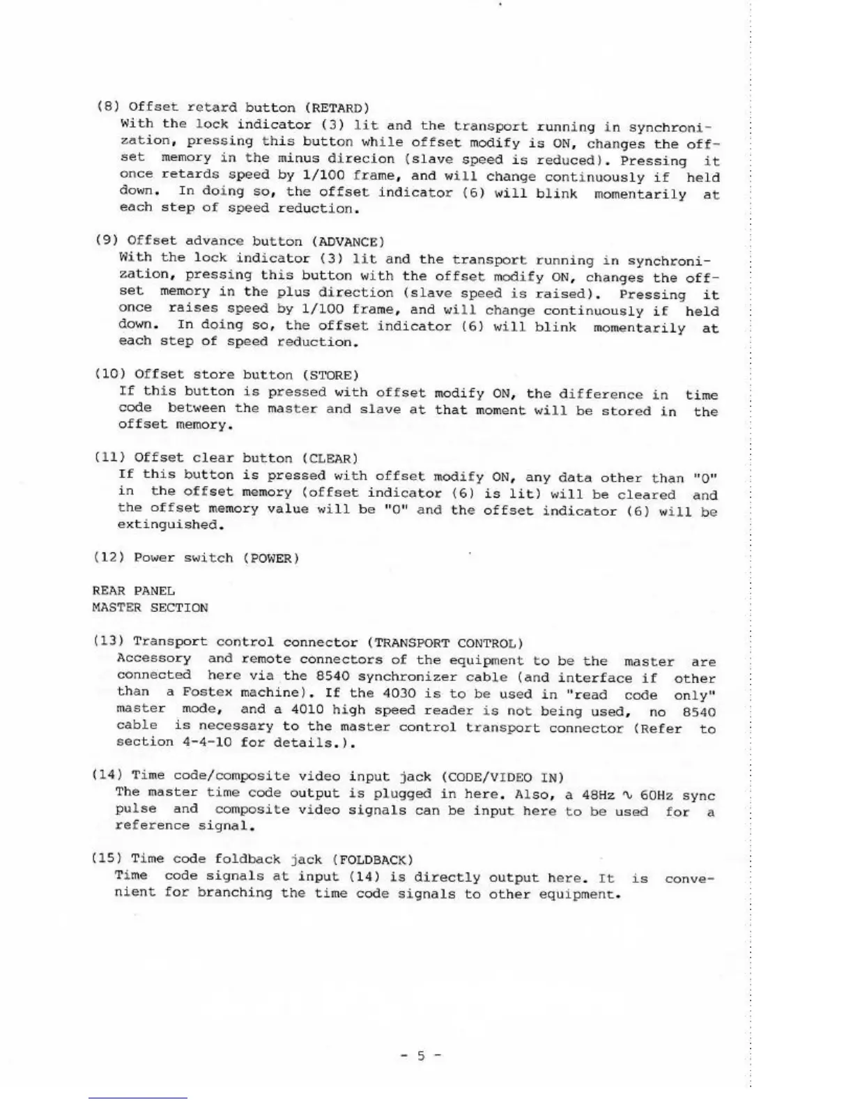 Fostex 4030 - Rear Panel Facilities; Offset Retard Button; Offset Clear Button; Transport Control Connector