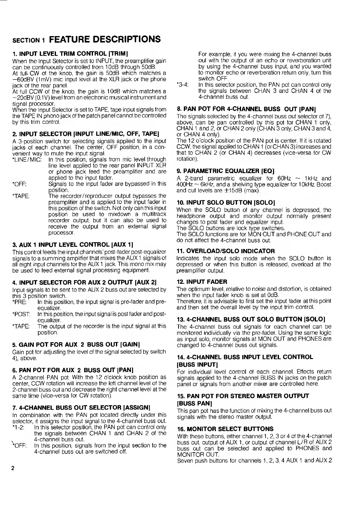 Fostex 450 - Section 1 Feature Descriptions; Input Level Controls (Trim, Fader); Input Signal Selection & Routing; Equalizer and Solo Functions