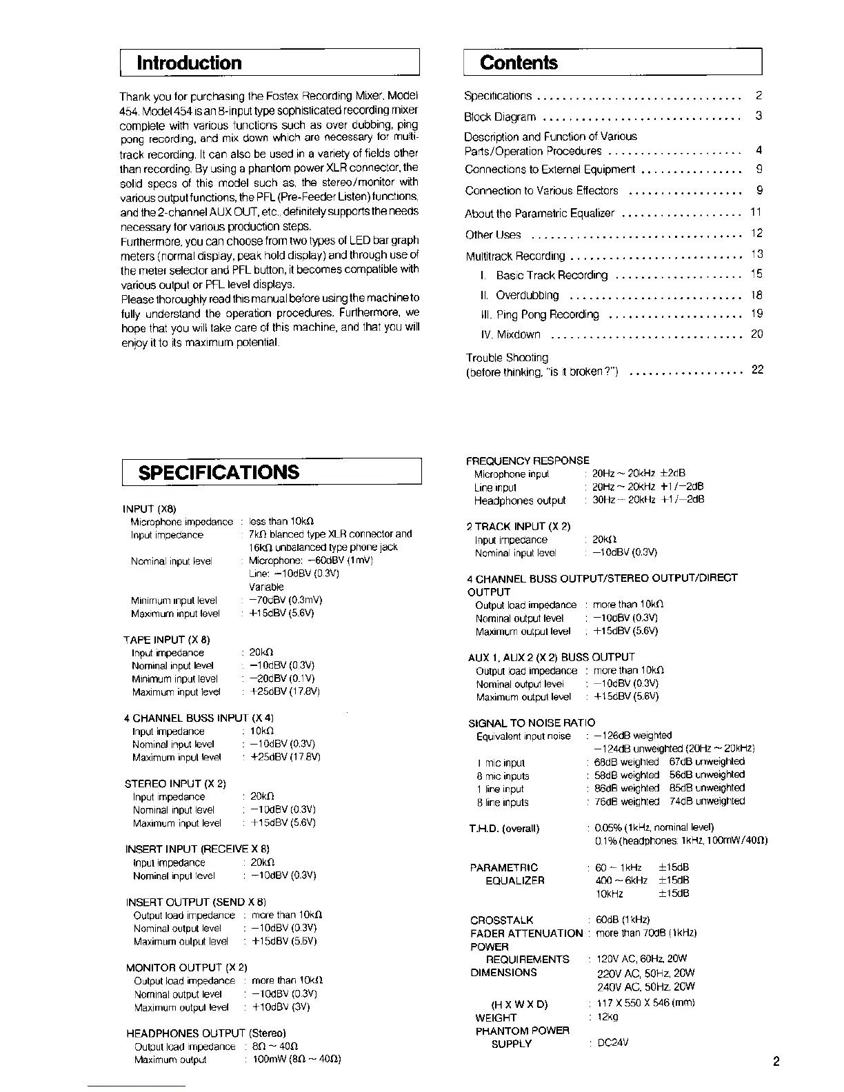 Fostex 454 - Technical Specifications; Input;Output Specifications; Performance Specifications; Power, Dimensions, and Weight