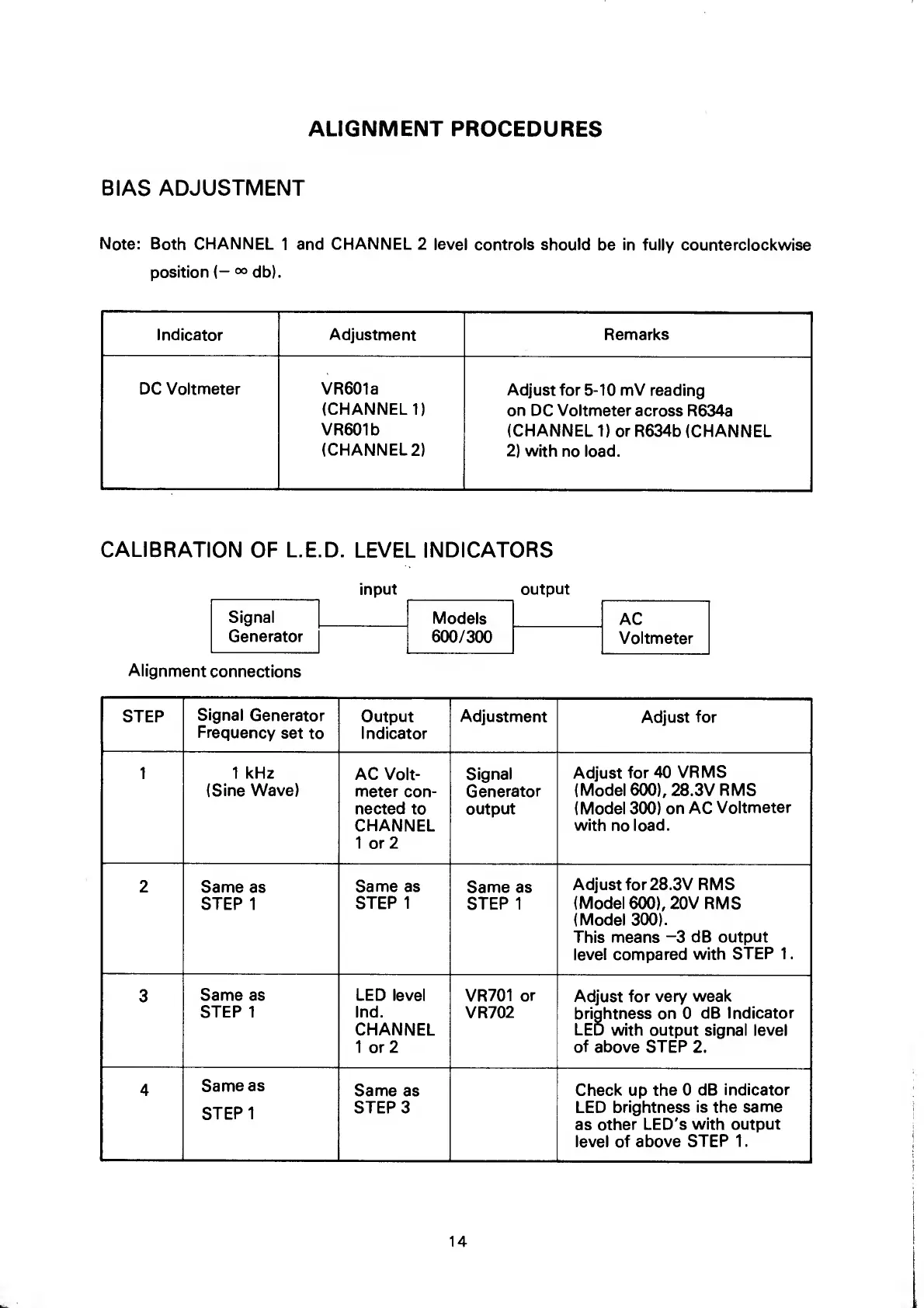 Fostex 600 - ALIGNMENT PROCEDURES; BIAS ADJUSTMENT; CALIBRATION OF L.E.D. LEVEL INDICATORS