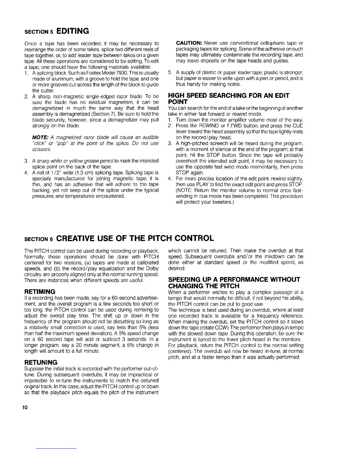 Fostex 80 - Section 5 Editing; High Speed Searching for an Edit Point; Section 6 Creative Use of the Pitch Control; Retiming