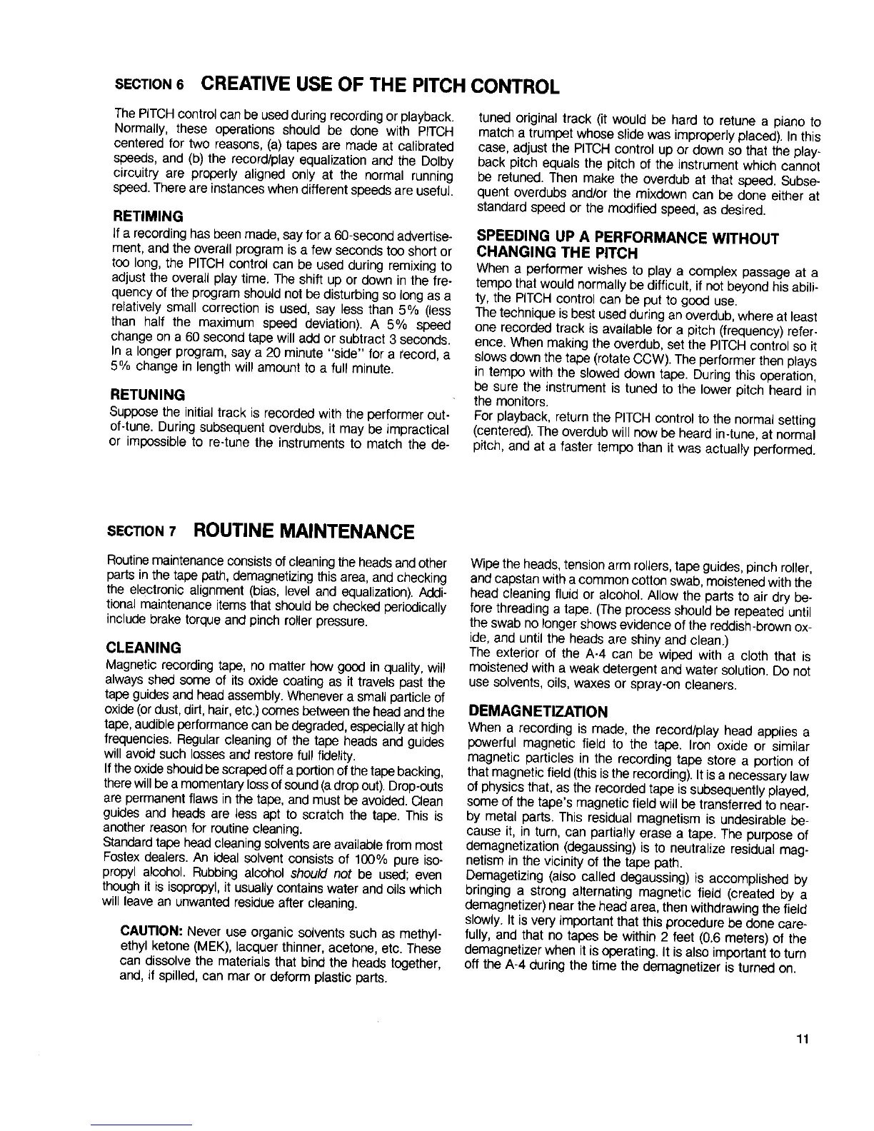 Fostex A-4 - Fostex Model A-4 Pitch Control Usage; Creative Use of Pitch Control; Fostex Model A-4 Routine Maintenance; Cleaning Tape Heads and Guides