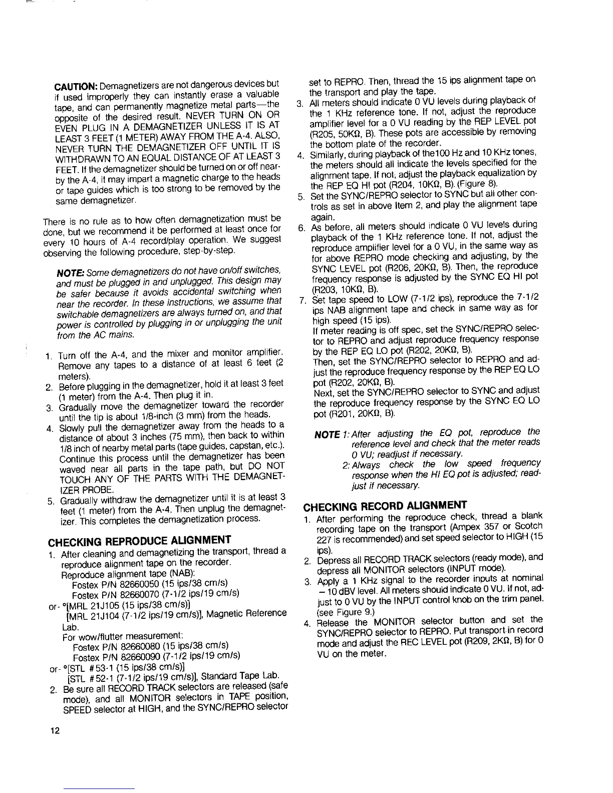 Fostex A-4 - Fostex Model A-4 Alignment Checks; Reproduce Alignment Check; Record Alignment Check
