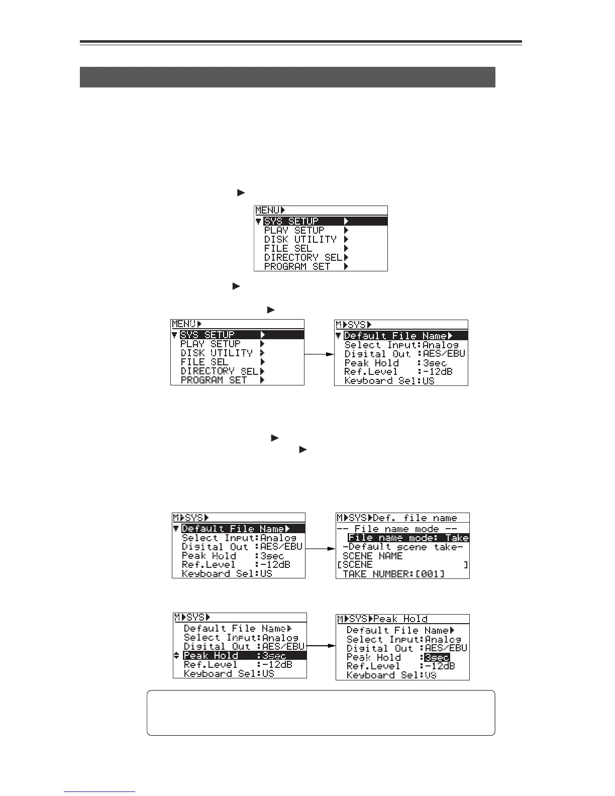 The basic procedure for using the "SYS SETUP" menu is as described below, though the actual