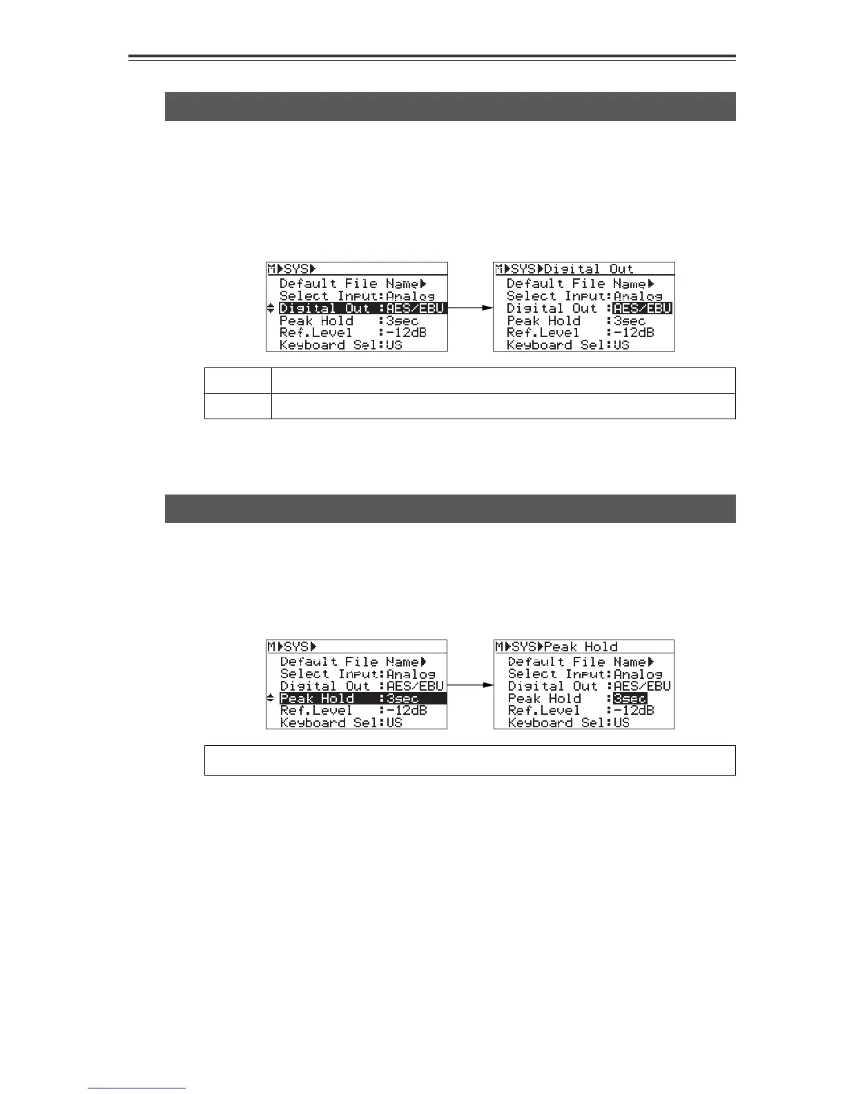 The "Digital Out" menu item selects the format (AES/EBU or S/P DIF) of the digital signal