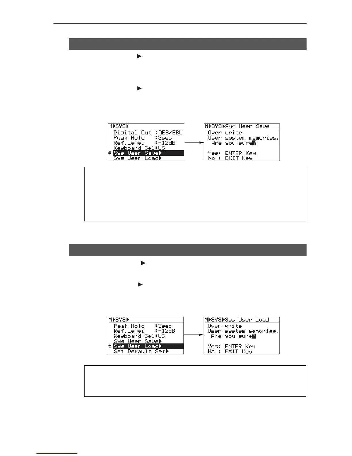 Select "Sys User Save " on the SYS SETUP menu screen and press the [ENTER/YES] key.