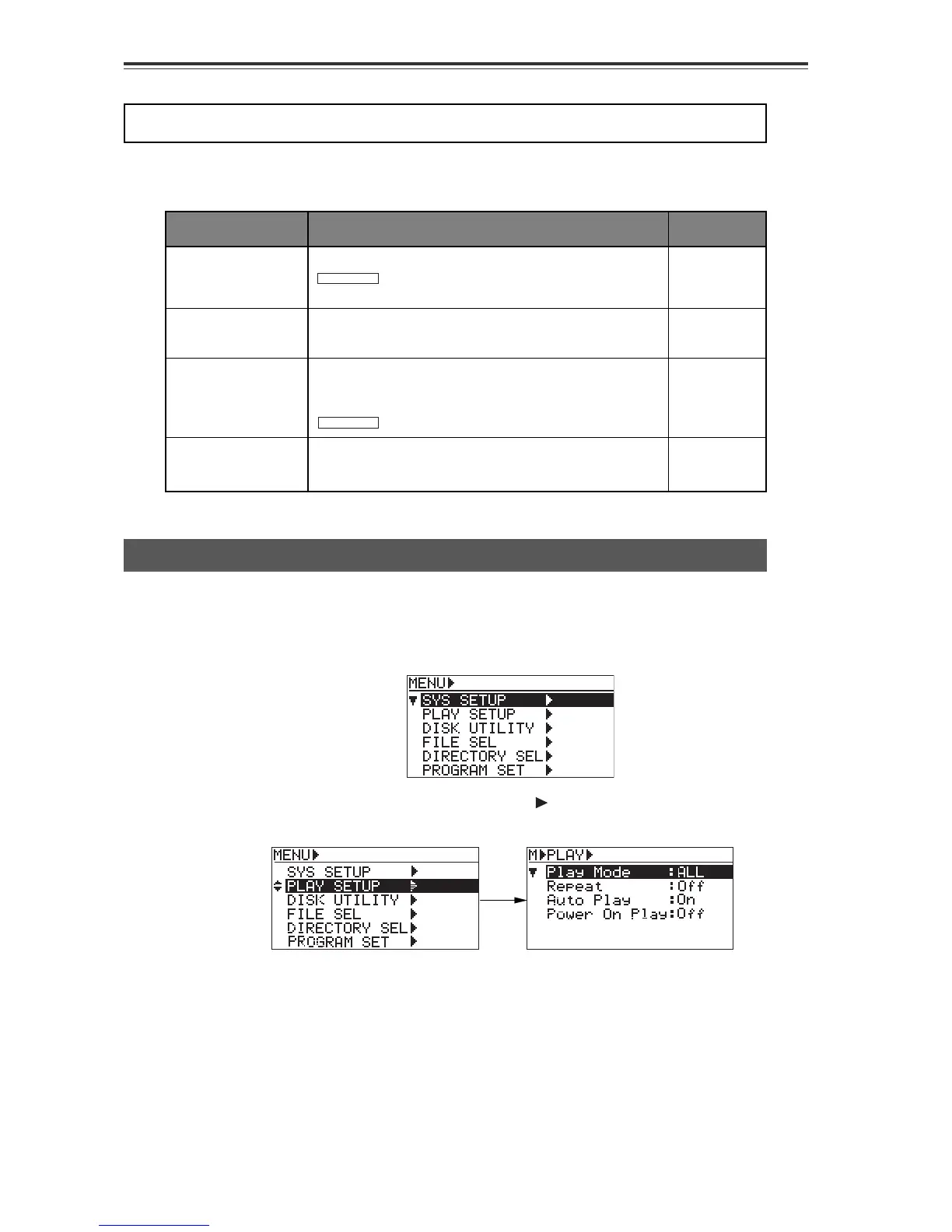 In the PLAY SETUP menu, four menu items are available. The following table shows each