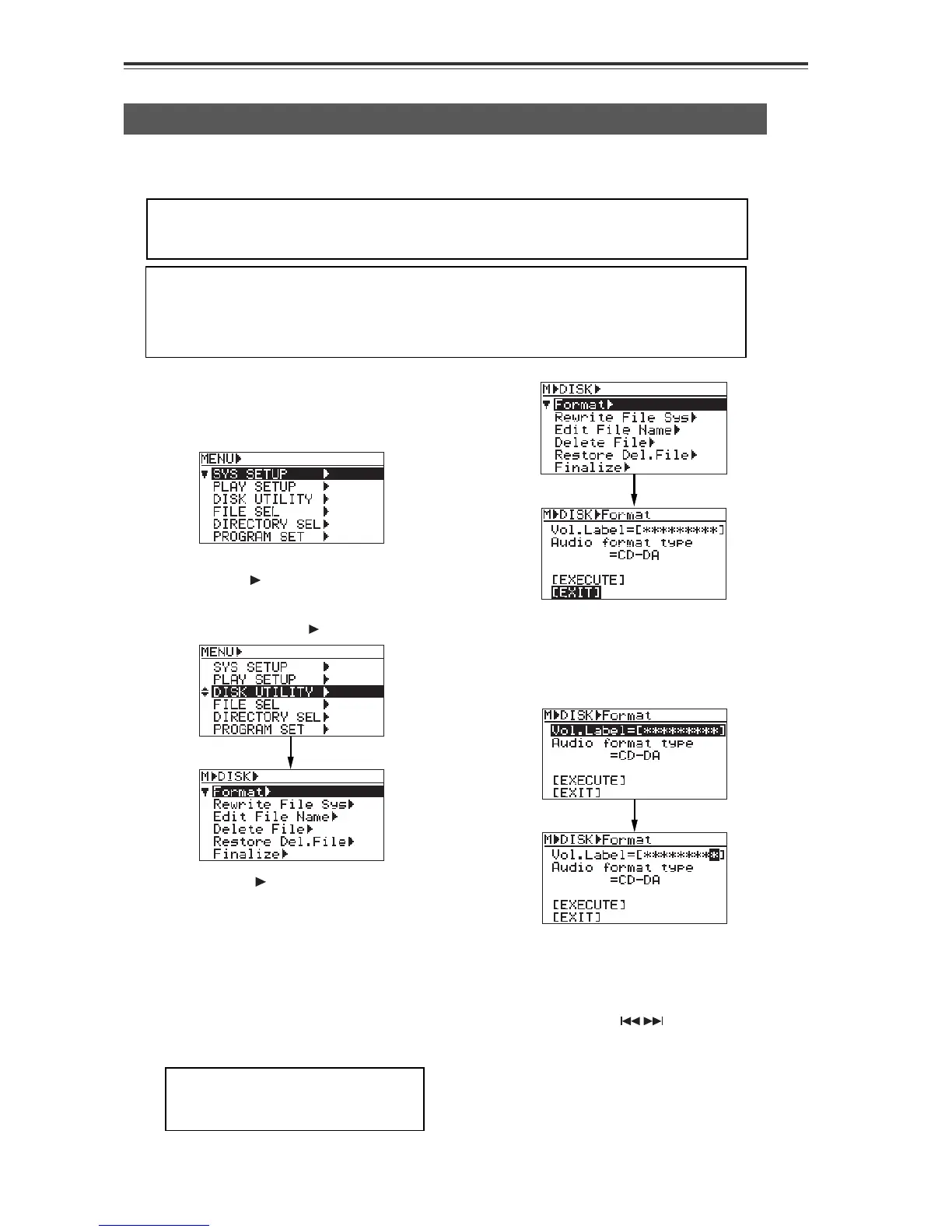 CD-R/RW MASTER RECORDER CR500 (MENU mode: DISK UTILITY menu)