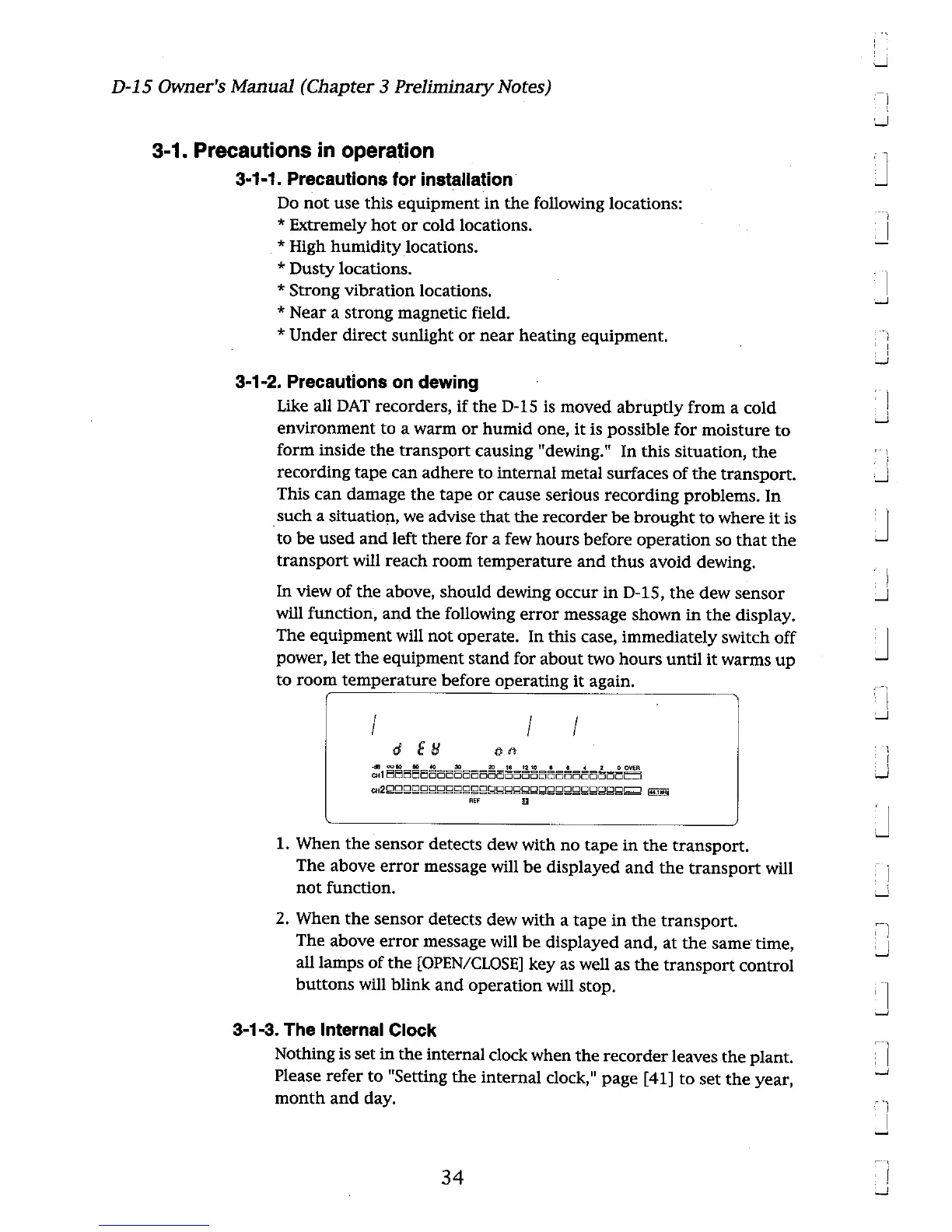 Fostex D-15 - Precautions in Operation; Precautions for Installation; Precautions on Dewing; The Internal Clock
