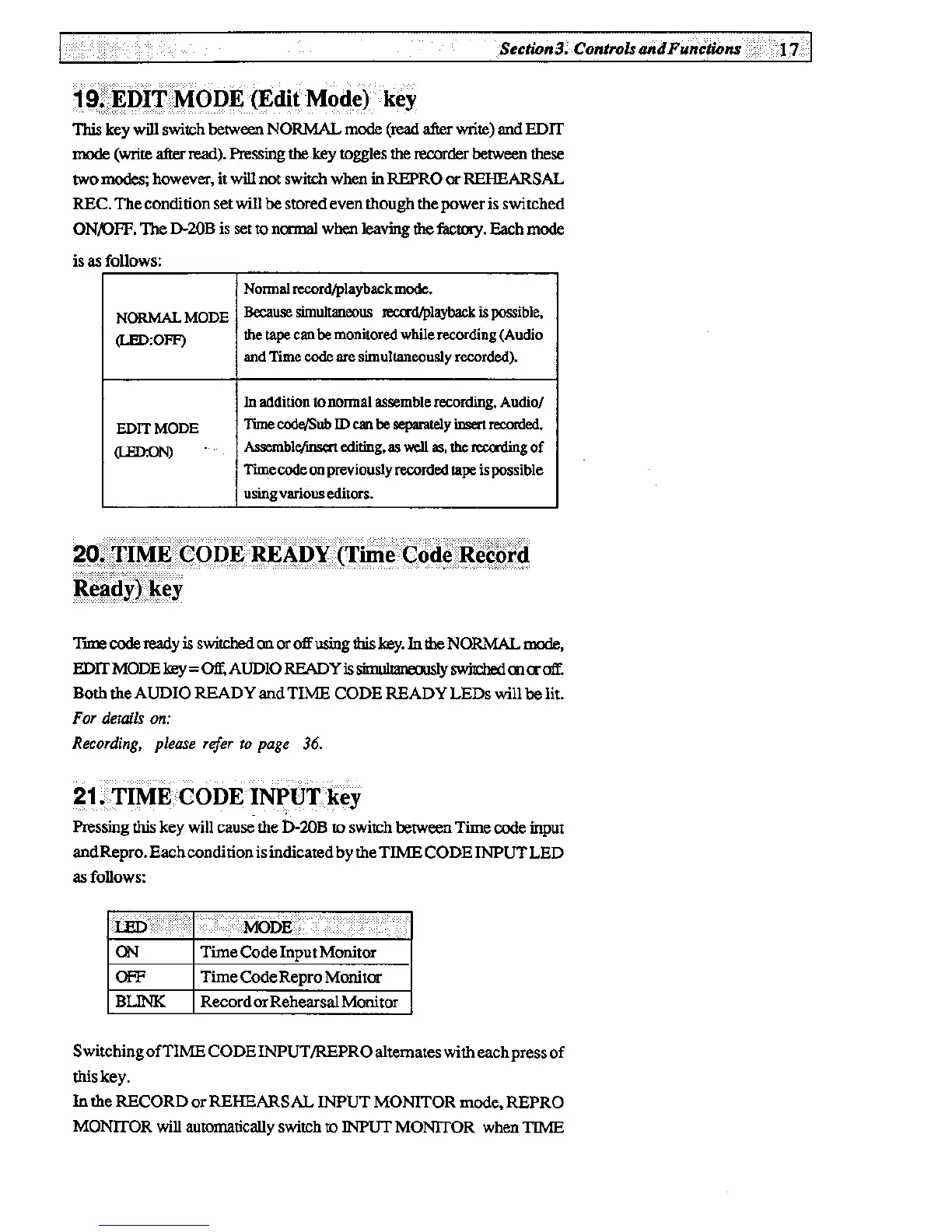 Fostex D-20B - Edit Mode; Time Code Ready; Time Code Input Key