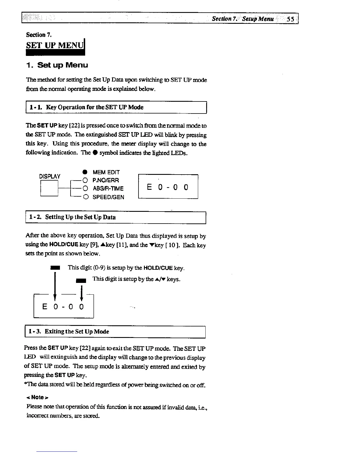 Fostex D-20B - Setup Menu; Key Operation for the Set up Mode; Setting up the Set up Data; Exiting the Set up Mode